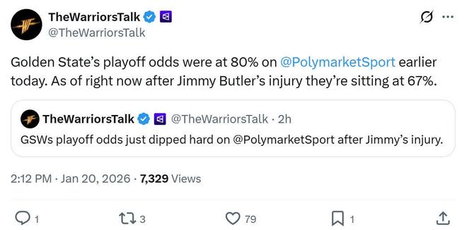 體育預測市場平臺Polymarket Sports也在第一時間更新勇士進入季后賽的概率,在巴特勒受傷后這一數據從80%暴跌至67%,迅速下滑13個百分點。