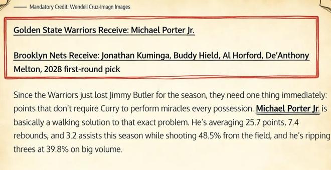 美媒《Fadeaway World》撰文建議,勇士應(yīng)該將庫明加、希爾德、霍福德、梅爾頓以及2028年的首輪簽送到籃網(wǎng),換回前鋒小波特。