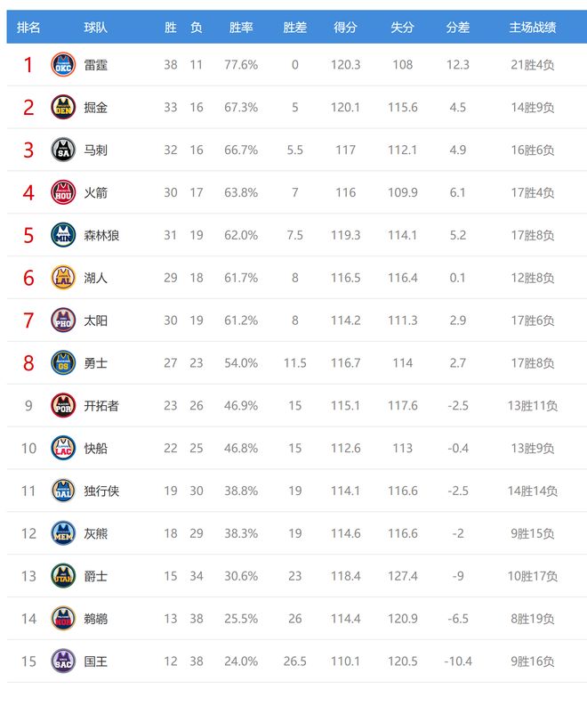 今日比賽后馬刺、掘金排名互換,森林狼、湖人、太陽排名互換,其他西部球隊排名不變。