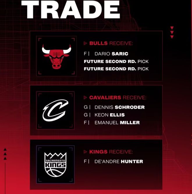 騎士得到:基翁-埃利斯、丹尼斯-施羅德、伊曼紐爾-米勒;國(guó)王得到:德安德烈-亨特;公牛得到:達(dá)里奧-薩里奇、2027年次輪簽、2029年次輪簽。