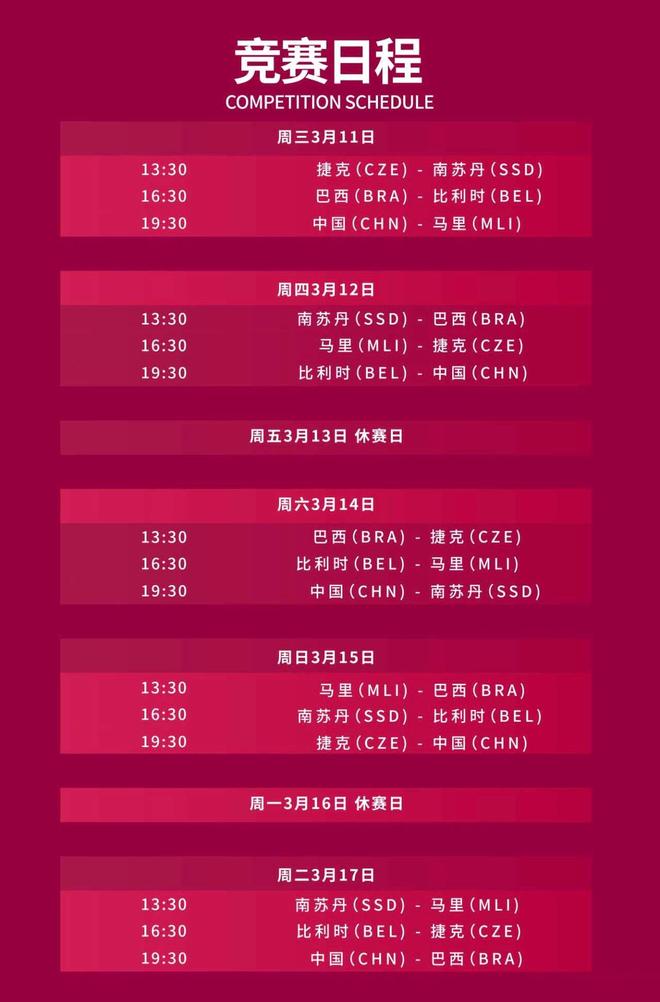 中國女籃第二場、第三場分別將在3月12日對陣比利時女籃、3月14日對陣南蘇丹女籃