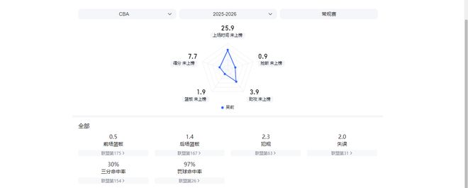 本賽季半程過后,王奕博場均僅能為青島男籃貢獻5.3分1.3籃板3.6助攻,同時場均還能出現1.4次失誤和2.4次犯規。而在過往的20次出場中,他得分上雙的比賽也只有4場。