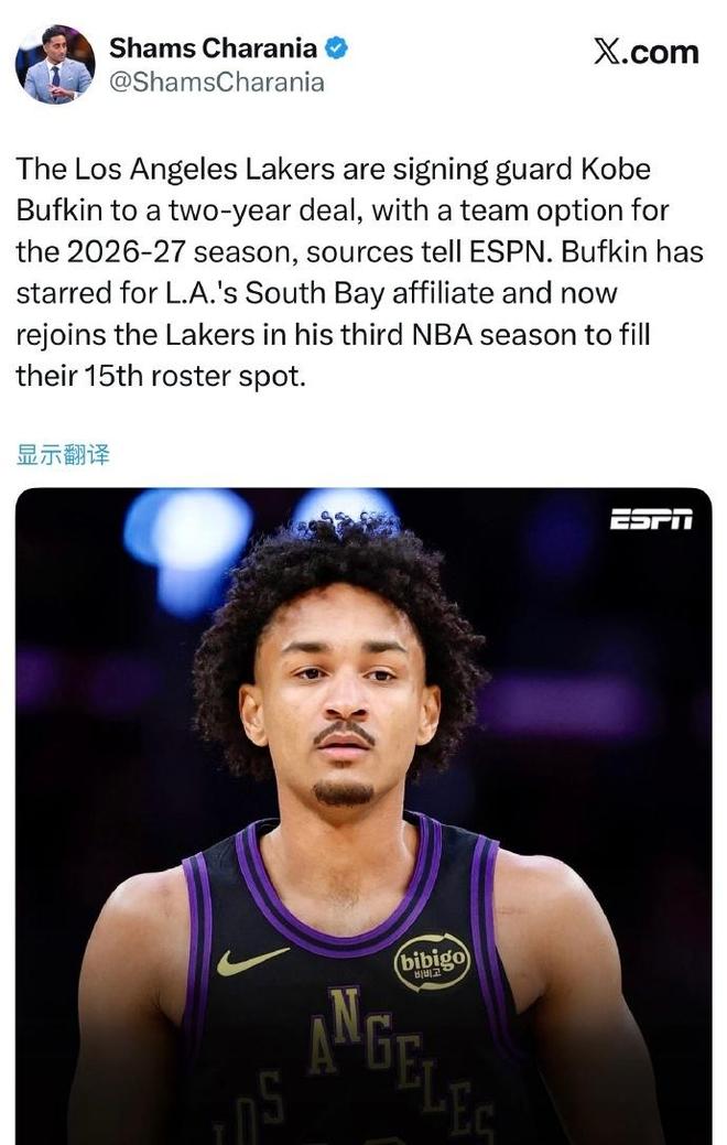 北京時間2月8日,根據ESPN名記Shams報道,洛杉磯湖人用一份1+1的兩年正式合同簽約后衛科比-巴夫金,其中第二年是球隊選項,他成為湖人陣容第15人,曾經在G聯賽有過單場41+8+8三分表現。