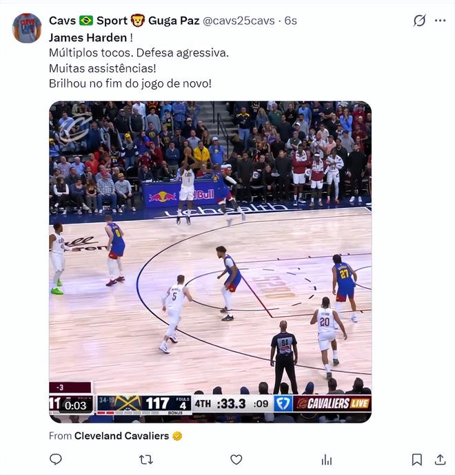 這場比賽詹姆斯-哈登再度成為克利夫蘭的超級英雄,在上一場對陣國王的末節他連續命中關鍵三分,末節4中4拿到15分(7分鐘),而這場比賽對陣聯盟頂級豪強掘金,哈登在末節又用三分球幫助騎士續命。