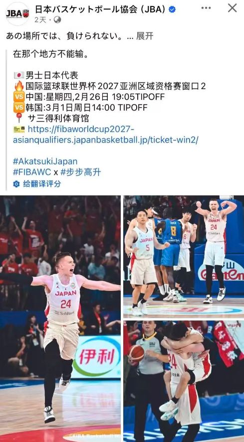 日本官方列出了世預賽對陣中國男籃和韓國隊的比賽時間,并且寫道:“在那個地方絕對不能輸。”