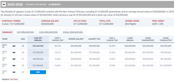 墨菲26-27賽季的合同是2700萬,而詹姆斯今夏到期5262萬、八村壘今夏到期1825萬、肯納德今夏到期1100萬,克勒貝爾今夏到期1100萬,這四人合計可以清理出9287萬的薪金空間,湖人可以直接吃下墨菲的合同,也可以用里夫斯先簽后換。