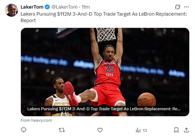 北京時間2月14日晚,湖媒Laker Tom也透露,在2026年休賽期湖人隊有引進三年1.12億合同的墨菲的打算。