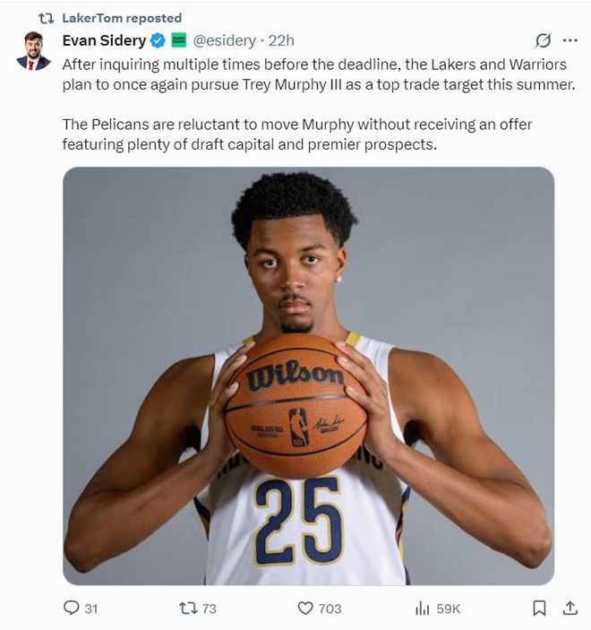 北京時間2月13日,《福布斯體育》記者埃文-斯迪瑞透露,鵜鶘隊在交易截止日不會交易錫安、墨菲、瓊斯三位鋒線,但在今夏休賽期勇士、湖人兩支球隊有意交易得到特雷-墨菲,鵜鶘隊不愿意在沒有收到大量首輪簽資產的情況下低價送走墨菲。