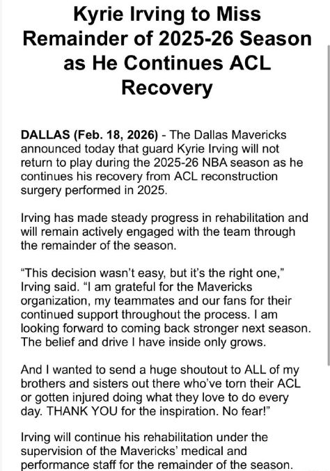 北京時間2月18日,當名記Shams報道表示,歐文本賽季不會復出,隨后獨行俠官方確認,歐文將于2026-27賽季復出回歸賽場。在獨行俠交易送走濃眉哥后,本賽季已經(jīng)確定繼續(xù)重建,因而歐文復出已經(jīng)沒有意義。