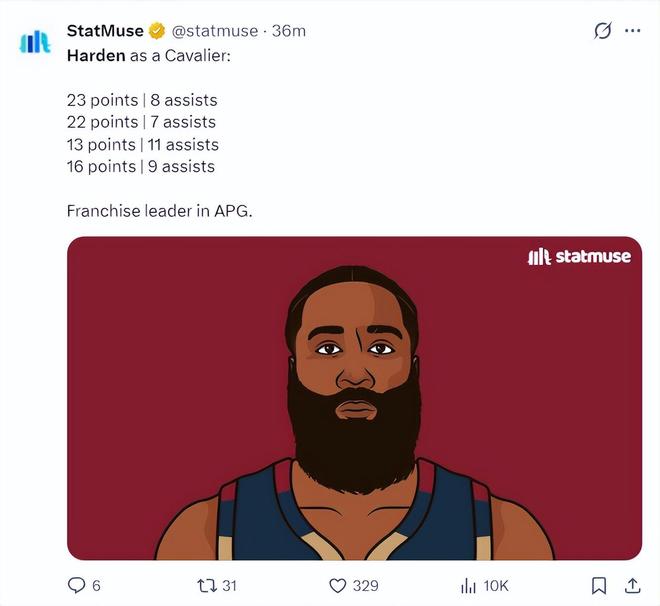 哈登被交易到騎士后的四場比賽:23+8、22+7、13+11、16+9,他是同期助攻數(shù)最多的那個,他在騎士打控球后衛(wèi)時騎士的進攻非常流暢。