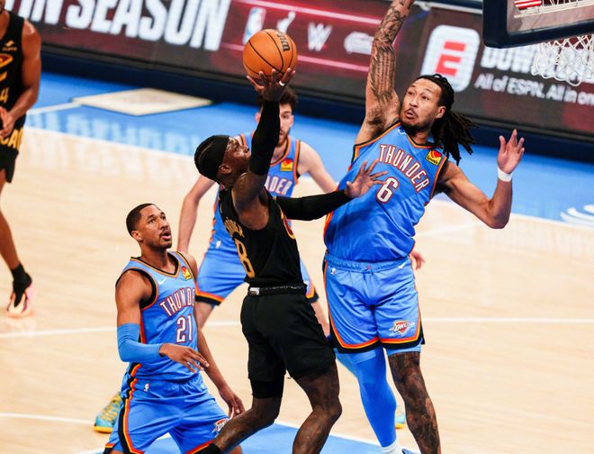 進入下半場,騎士發力:梅里爾連中兩記三分+急停跳投,莫布里單打霍姆格倫+米切爾快攻拋投,騎士瞬間追平!此后哈登連續擋拆喂餅阿倫,不過雷霆依靠伊塞亞喬和華萊士屢屢給出回應,騎士失誤確實有點多。后半段哈滕重扣,伊塞亞喬橫移三分球,雷霆再度拉大分差,危急時刻米切爾大回環拋射,聯合泰森再度追平,節末維金斯跳投+霍姆格倫罰球,三節打完時,騎士86-89落后。決戰第四節,多特單打+霍姆格倫吃餅扣籃,雷霆再度起勢。莫布里三分球很關鍵,但肯威和霍姆格倫回應5分。