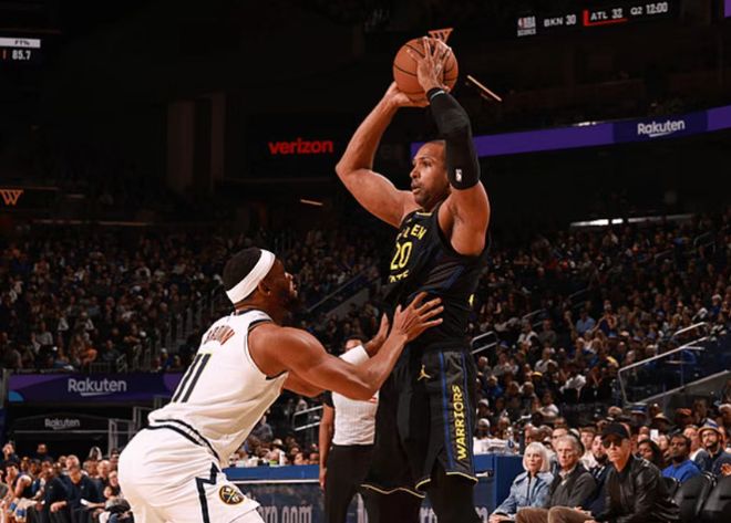 勇士過去兩場連續主場輸給馬刺與凱爾特人遭遇2連敗,掘金上一場客場157-103狂勝開拓者,本賽季前兩次交鋒雙方各取一勝。本場勇士缺少庫里兄弟、巴特勒、追夢與波爾津吉斯,掘金缺少戈登、皮克特與沃特森。首節開局雙方2-2,穆迪、霍福德與梅爾頓各中一記三分取得9分優勢,掘金連追5分。穆迪再中三分,布勞恩三分與2+1連追6分,穆迪再中三分與小佩頓內線命中,布勞恩上籃追分。波杰姆斯基三分命中,掘金一波7-2攻勢追到差2分,勇士內外開花一波15-4攻勢,首節結束掘金27-39落后勇士。首節掘金三分6中1,約基奇9中2得到7+8+8+2與布勞恩12分;勇士三分19中9,霍福德11分3助攻與穆迪8分。