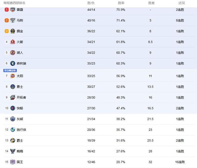 西部現在的局勢,雷霆西部第1的位置在馬刺的追趕下也有些岌岌可危,而馬刺隊之后,掘金、火箭、湖人,3隊之間的勝負差只有 1場,在爭奪著西部第3的位置!