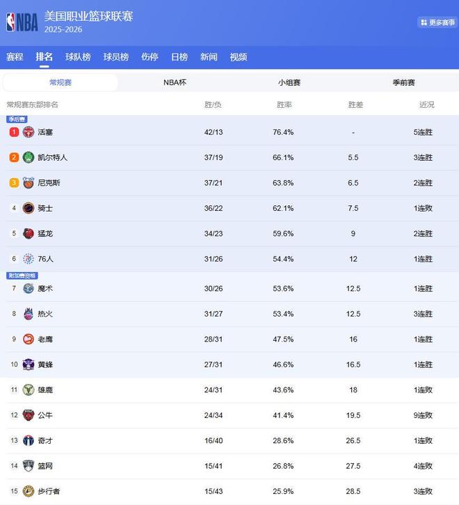 東部的競爭也很大,活塞穩坐第1,綠軍也是霸占了第2的位置,而騎士隊,則是戰績被尼克斯反超,掉到第4位!