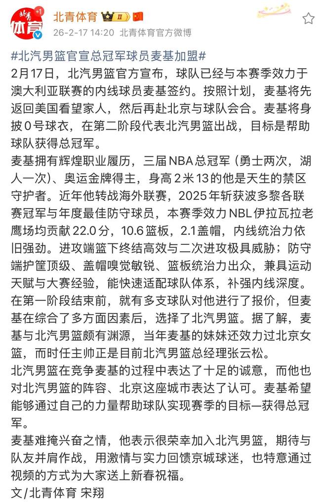 加盟北京男籃,麥基非常激動,錄制了視頻向北京球迷送上新春祝福!首鋼俱樂部在競爭麥基的過程中表達了十足的誠意,麥基也對北汽男籃的陣容、北京這座城市表達了認可,麥基希望能夠通過自己的力量幫助球隊實現賽季的目標—獲得總冠軍。