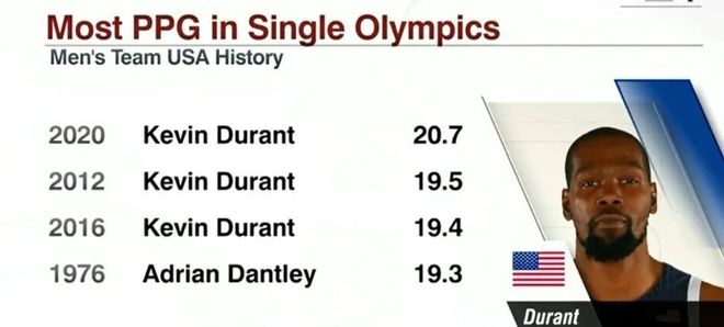 值得注意的是,美國男籃奧運歷史上,單屆場均得分前三的都是杜蘭特(分別就是杜蘭特的前三次奧運會之旅),他的得分能力有多么突出足以見得。