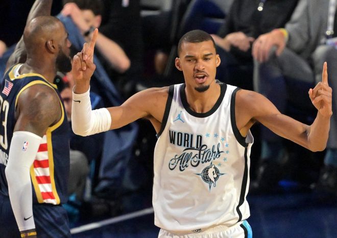 馬刺本賽季面對聯盟戰績前五的球隊(不算他們自己),戰績為8勝1負!這其中對陣雷霆4勝1負,面對活塞+凱爾特人+掘金+尼克斯各取一勝(NBA杯賽總決賽輸給尼克斯不算入常規賽成績)。9場比賽,馬刺合計凈勝對手47分,場均凈勝5.2分,這已經是聯盟所有球隊中,面對戰績前五的最佳表現了!首先,馬刺本賽季的崛起,自然離不開文班亞馬的帶隊統治力。場均24.2分11.3籃板2.9助攻2.8蓋帽,基礎數據是全能六邊形戰士。此外,文班亞馬在場時,馬刺百回合能贏對手13.5分,反之則是+0.2,文班亞馬On-Off值是+13.3。