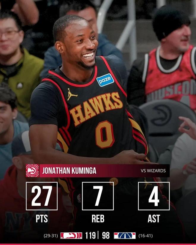 迎來(lái)老鷹生涯首秀的庫(kù)明加表現(xiàn)十分搶眼,替補(bǔ)出戰(zhàn)約24分鐘,投籃12中9,其中三分4中3,罰球7中6無(wú)比高效砍下27分外加7板4助2斷全面數(shù)據(jù),正負(fù)值+16,幫助新東家119-98輕松擊敗奇才。