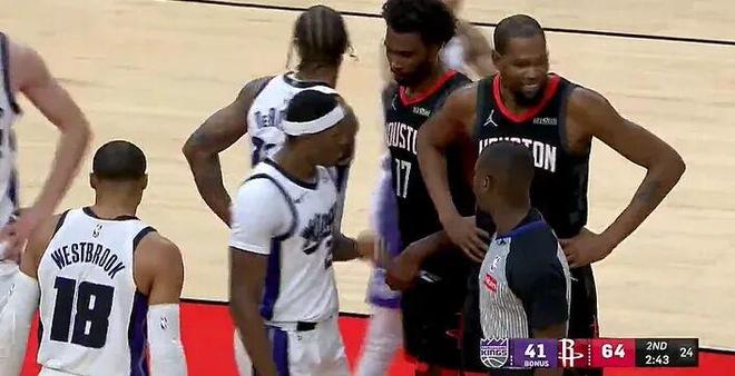 哪怕半場不到主落后20+,威少仍不忘初衷,莽撞地背后一把推搡申京犯規,隨后杜蘭特上前笑著和威少交流:老伙計,悠著點啊!