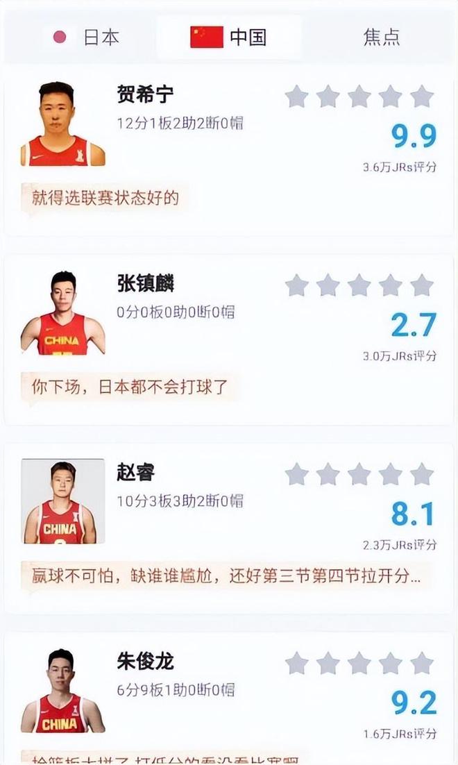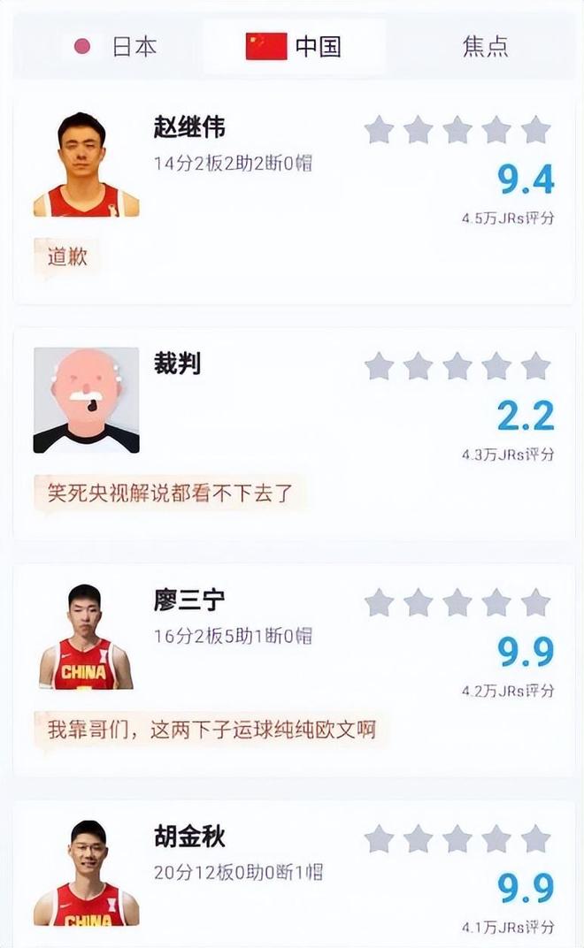 接著說一下評分比較高的球員,總共有六人的評分超過了9分,分別是胡金秋、賀西寧、廖三寧、趙繼偉、朱俊龍和高詩巖。其中胡金秋、賀西寧、廖三寧的評分高達9.9分,這足以說明了他們的表現堪稱完美。胡金秋進攻端和護框的穩定性、賀西寧的三分球、廖三寧的突破,都給了中國男籃很大幫助,也是球隊能夠逆轉取勝的大功臣,這點毋庸置疑。