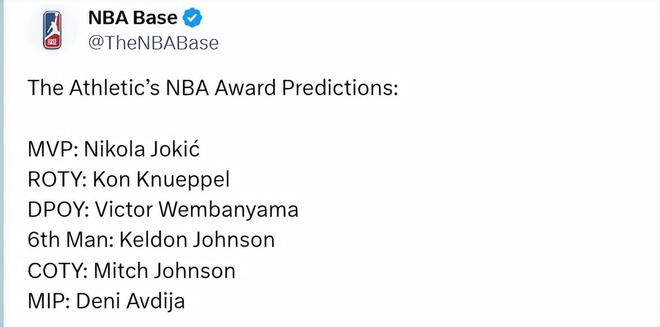 北京時間2月27日,知名美媒TheAthletic(TA)對2025-26賽季的常規賽六大獎項進行預測,他們看好約基奇成為MVP,克努佩爾當選最佳新秀,馬刺三人獲獎成為最大贏家。具體預測和解析如下——