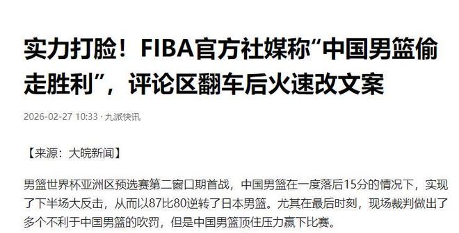 國際男聯稱“中國男籃偷走勝利”。