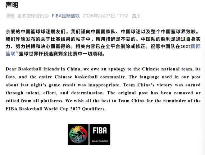 在輿論壓力持續升溫后,2月27日,國際籃聯通過其中文微信公眾號發布正式致歉聲明。
