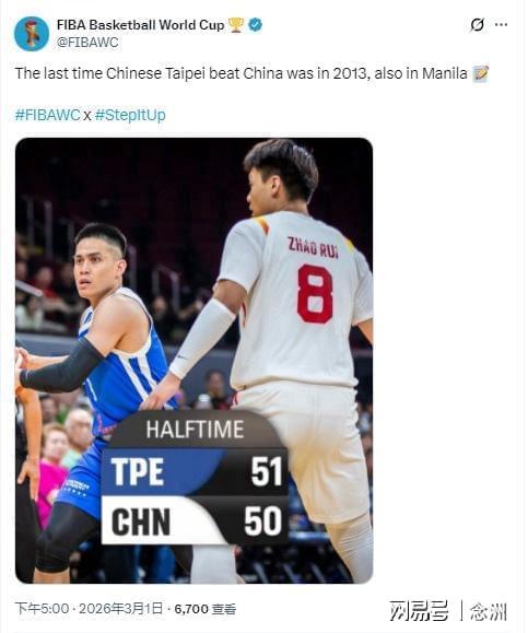 本場比賽,中國男籃上半場50-51落后中國臺北,FIBA世界杯官方賬號已經蠢蠢欲動,列出上一次中國臺北擊敗中國男籃的歷史:2013年,也是在馬尼拉!