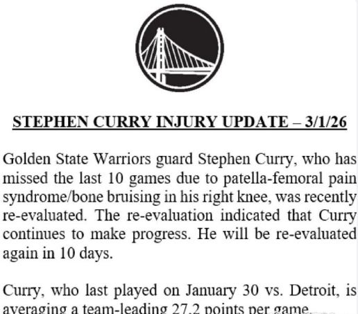 北京時間3月2日,當庫里生涯第2次因傷缺席整個2月份的比賽,如今根據勇士官方傷病報告顯示,庫里將在10天后去復診他的跑步膝,也將至少再缺席5場比賽,對于勇士整體戰斗力是極大的削弱。