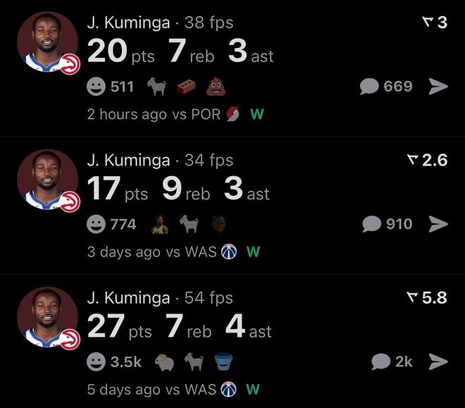而他的這次爆炸表現之后,最近的這三場比賽,庫明加為老鷹隊貢獻了場均21.3分7.7籃板3.3助攻的數據,場均已經完成了20+,考慮到他是替補上場,庫明加打得是真的很爽。老鷹球迷已經完全嗨了,拿了一個病號波爾津吉斯換來了庫神?他們的球迷在比賽過程當中大喊:“謝謝你,金州勇士!”