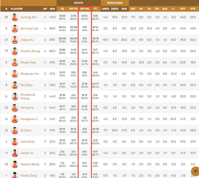 朱俊龍四場球三分13中6,程帥澎兩場三分12中6,高詩巖4場三分12中5,賀希寧兩場12中5,趙繼偉兩場12中6,這些球員都是三分投得非常出色的存在,可賀希寧與趙繼偉兩人不管是產(chǎn)量、命中率都在第一檔。