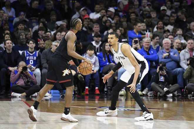 馬刺上一場客場89-114輸給尼克斯結束11連勝,76人上一場客場98-114輸給凱爾特人結束3連勝。本場76人缺少恩比德、烏布雷與喬治,馬刺缺少巴恩斯、加西亞與普拉姆利。首節馬刺用團隊攻勢逐步壓制殘陣76人,首節馬刺22中11保持5成準星,其中三分11中3,文班亞馬0出手僅借助罰球2中2,得到2分3籃板1助攻4蓋帽更多在防守端發揮威力,哈珀5中4得到11分與??怂?分5助攻。76人28中9,其中三分11中5,馬克西7中2得到8+5+2與埃奇庫姆6中1僅得到2分,首節比賽結束馬刺32-25領先76人。