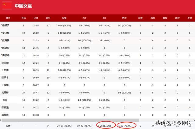 另外一個指標則是三分球投籃命中率,中國女籃全隊交出了28投5中,巴西女籃則是30投9中,從超過1個月的集訓,以及主場作戰的層面,這個投籃命中率肯定是偏低,甚至還不如巴西女籃。而19個失誤想要在正規FIBA比賽贏球,同樣難度極大。