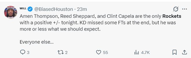休媒Will:阿門、謝潑德、卡佩拉是今晚火箭正負值為正的三人,雖然KD在決勝時刻罰丟了一個球但他的表現基本符合我們的預期,但其他人就..........
