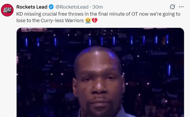 火箭媒體:加時賽關鍵時刻杜蘭特丟了絕平的罰球,我們又一次輸給沒有庫里的勇士。
