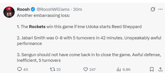 這場比賽后火箭隊遭噴上了全美熱搜,隊內只有少數的球員沒有被批判,就連拿到30+的謝潑德也遭批,因為謝潑德關鍵一次防守被梅爾頓單打自搶自投成功,那一球就是決定勝負的一球。