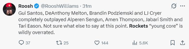 休媒:桑托斯、梅爾頓、波杰姆斯基、克萊爾的表現完全超過了申京、阿門、小賈、伊森,此刻我都不知道說什么好,我們火箭的年輕核心們明顯被高估了。