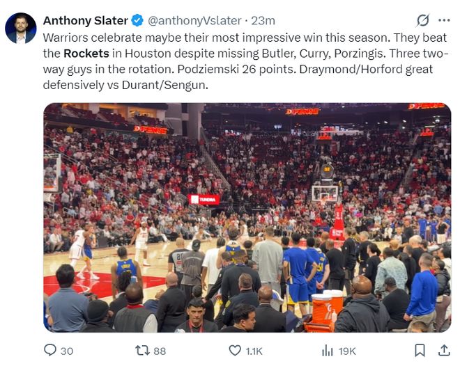 勇士記者安東尼-斯萊德:勇士或許迎來本賽季最矚目的勝利。失去了巴特勒、庫里、波爾津吉斯他們客場還是能擊敗西部第三的勇士。替補陣容的三位多面手發揮了重要作用,追夢/霍福德防守端發揮出色成功限制了申京與杜蘭特。