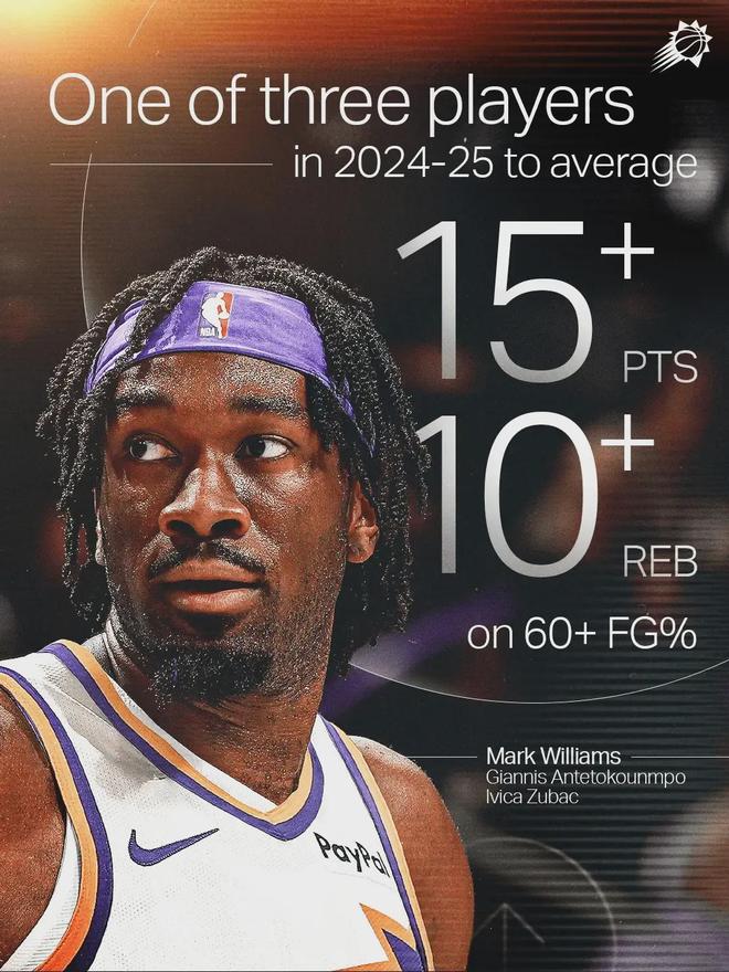 本賽季合同年的馬威(薪資628萬美元),為新東家出戰(zhàn)56場(chǎng)首發(fā)52次,場(chǎng)均上陣23.6分鐘貢獻(xiàn)11.6分8.1板(3.1前場(chǎng)板)1助,投籃命中率63.3%。