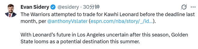 北京時(shí)間3月6日,據(jù)勇士隊(duì)記Slater報(bào)道,NBA交易截止日前,消息人士透露,勇士曾詢問過小賈倫-杰克遜、字母哥,也曾致電詢問萊昂納德的交易可能(當(dāng)時(shí)快船看似有意愿交易)。