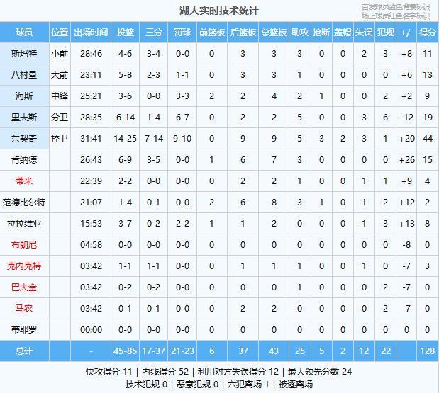 休息歸來湖人開局雖然慢熱優勢被縮小至7分,不過后半段及時回暖,尤其是東契奇延續手感拿分為球隊重新拉開15分左右的領先掌控比賽;第四節大比分之下東契奇沒有再登場,湖人也沒有受到太大壓力。最終,湖人主場128-117輕取步行者拿下比賽避免連敗。