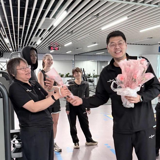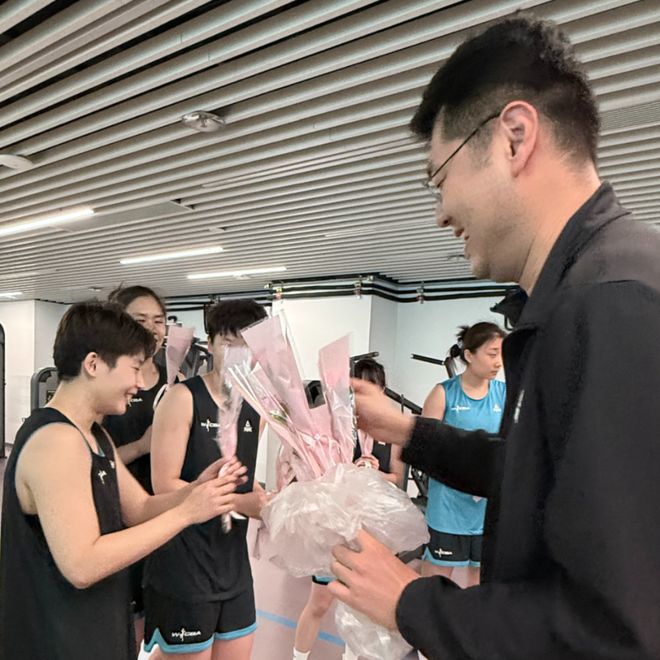 另一邊,俱樂部杯賽區訓練場里,北京首鋼園女籃主教練李翔也將鮮花送到了女籃姑娘們手中。