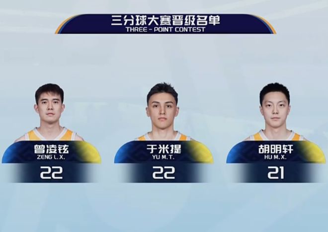 第一位出場的是2021年的三分大賽冠軍胡明軒,他在第一個點5中3,第二個點5中5表現(xiàn)出色,中路弧頂5中3,第四個花球點5中5,第五個點5中5表現(xiàn)出色,最后的超遠三分壓哨出手不中,最終獲得22分。