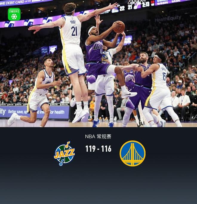 第四節,開節爵士希布韋連續內線得分再度領先10分,隨后勇士佩頓、桑托斯站出來得分止血,勇士梅爾頓持續沖框造殺傷得分追平比分,關鍵時刻勇士梅爾頓持續沖框不中,爵士辛森三分命中,哈克萊斯罰球領先4分,勇士梅爾頓三分續命,爵士哈克萊斯罰球全中領先3分,留給勇士最后1.7秒,桑托斯絕平三分不中,最終爵士119-116戰勝勇士。