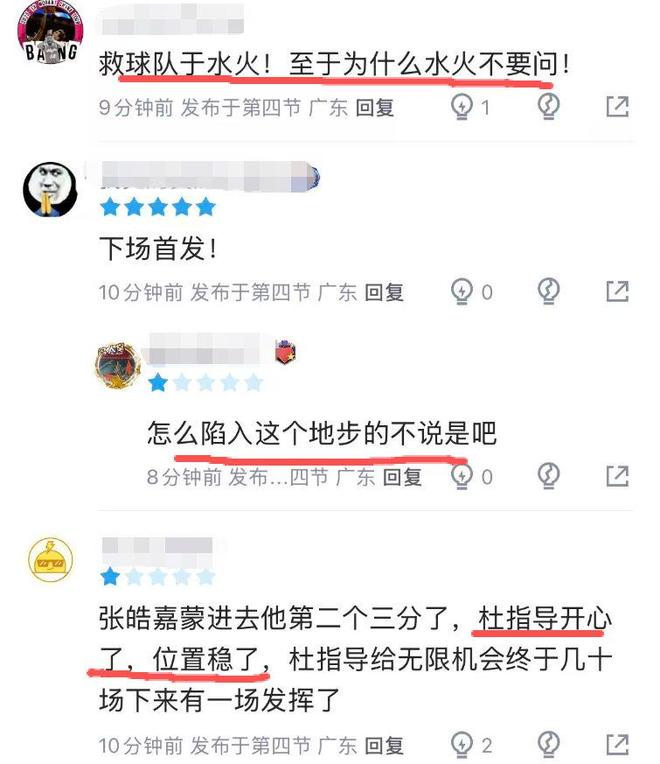 在廣東以4分優勢險勝深圳的比賽中,張皓嘉在前三節得分吞蛋的情況下,末節仍被杜鋒重用,雖然命中兩個關鍵三分球,拯救球隊于水火之中,但球迷對于張皓嘉仍不買賬:“球隊為什么陷入水火之中,你得問他”、“蒙進去第二個三分,杜指導開心了,位置穩了,給了無限機會,幾十場下來終于有一場發揮了?!?/p>