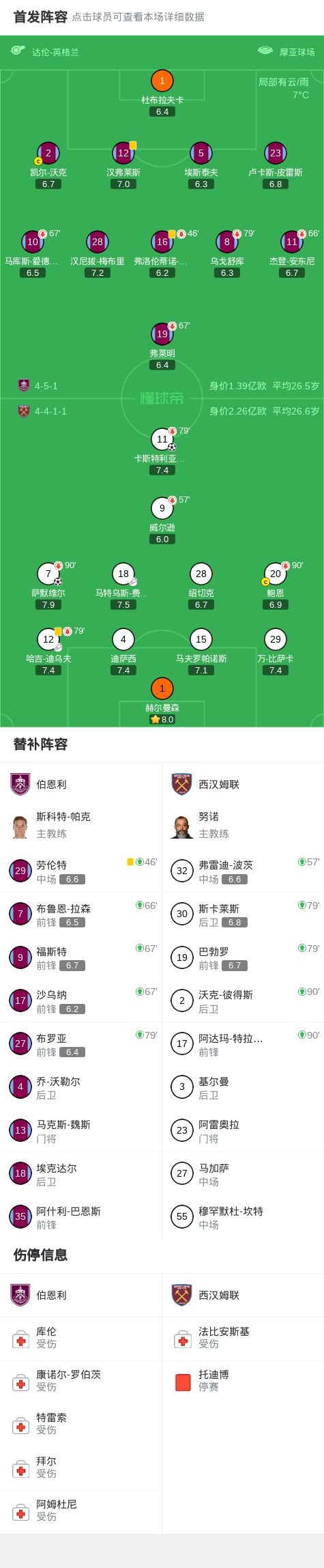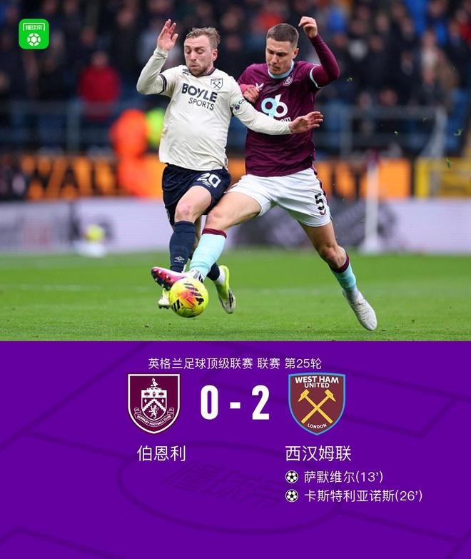 北京時間2月7日英格蘭足球頂級聯賽 聯賽 第25輪,伯恩利主場對陣西漢姆聯。西漢姆聯薩默維爾破門,卡斯特利亞諾斯破門。最終比分伯恩利 0-2 西漢姆聯。
