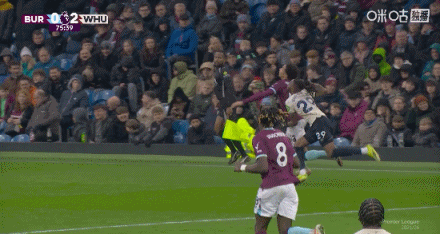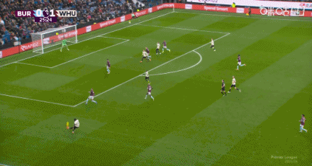 第25分鐘,迪烏夫傳中,卡斯特利亞諾斯頭槌破門,伯恩利0-2西漢姆聯