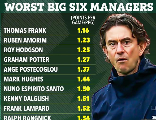 《太陽(yáng)報(bào)》指出,托馬斯-弗蘭克是英超歷史上BIG6豪門(mén)里戰(zhàn)績(jī)最差的正式主教練,場(chǎng)均僅1.16分,已經(jīng)比阿莫林還少。