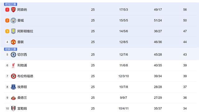 一場2-1之后,曼城積分50分,落后阿森納6分,但是也領先了身后阿斯頓維拉3分。而利物浦,則只有39分,距離歐聯杯賽區也有4分差距。