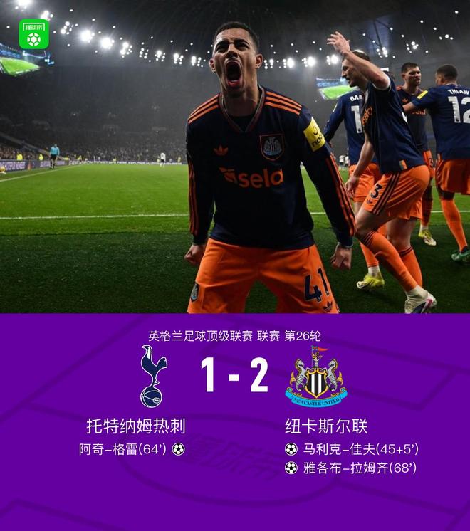 北京時間2月11日英格蘭足球頂級聯賽 聯賽 第26輪,托特納姆熱刺主場對陣紐卡斯爾聯。上半場,佳夫門前補射打破僵局。下半場,薩爾頭球擺渡,阿奇-格雷扳平比分。安東尼-戈登助攻,拉姆齊破門。全場比賽結束,熱刺1-2不敵紐卡,遭遇英超聯賽連續8輪不勝。